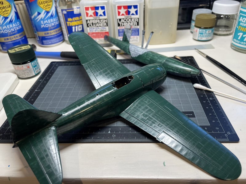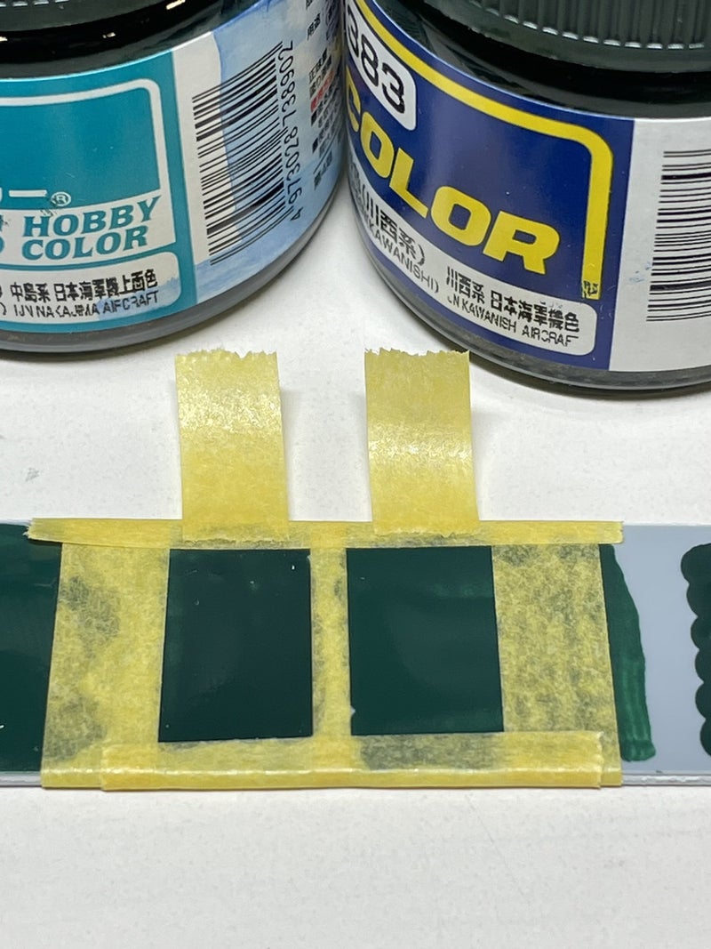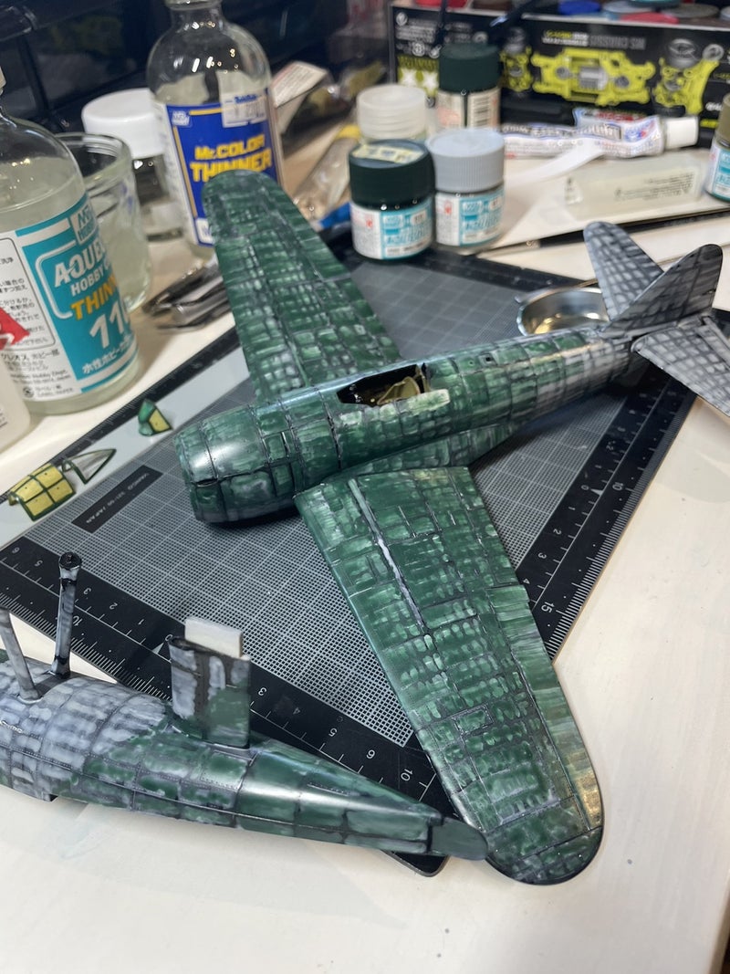 水性塗料で調色し、青みがかった川西航空機の暗緑色をつくりましたチーン