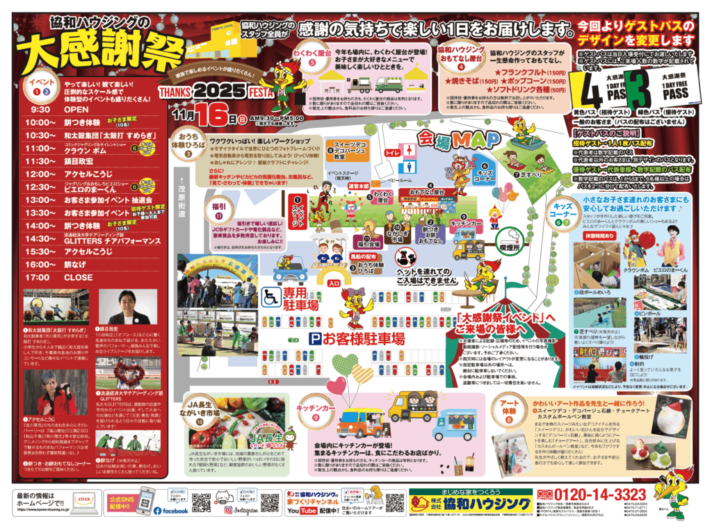 ものまね芸人のアクセルこうじさんのステージをはじめ、流通経済大学チアリーディング部GLITTERSさんや和太鼓集団太鼓内すめらぎさんのパフォーマンス、射的、餅つき、おもてなし屋台、キッチンカー、アート体験、芝すべり、住宅相談コーナーなど、ご家族皆様で楽しんでいただけるイベントが盛りだくさんです!