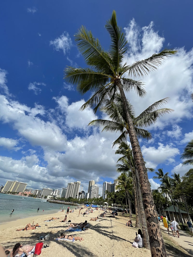 白い砂浜と遠浅の透き通った海、どこまでも青い空、ヤシの木越しに見えるダイヤモンドヘッド。