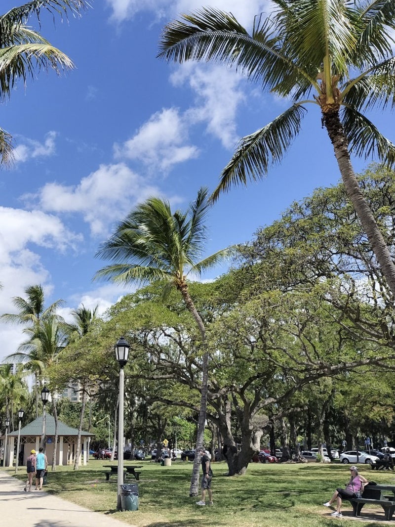 カピオラニ公園やクヒオビーチパークを歩き、波音とヤシの木の影を感じながらの散歩は贅沢な時間。