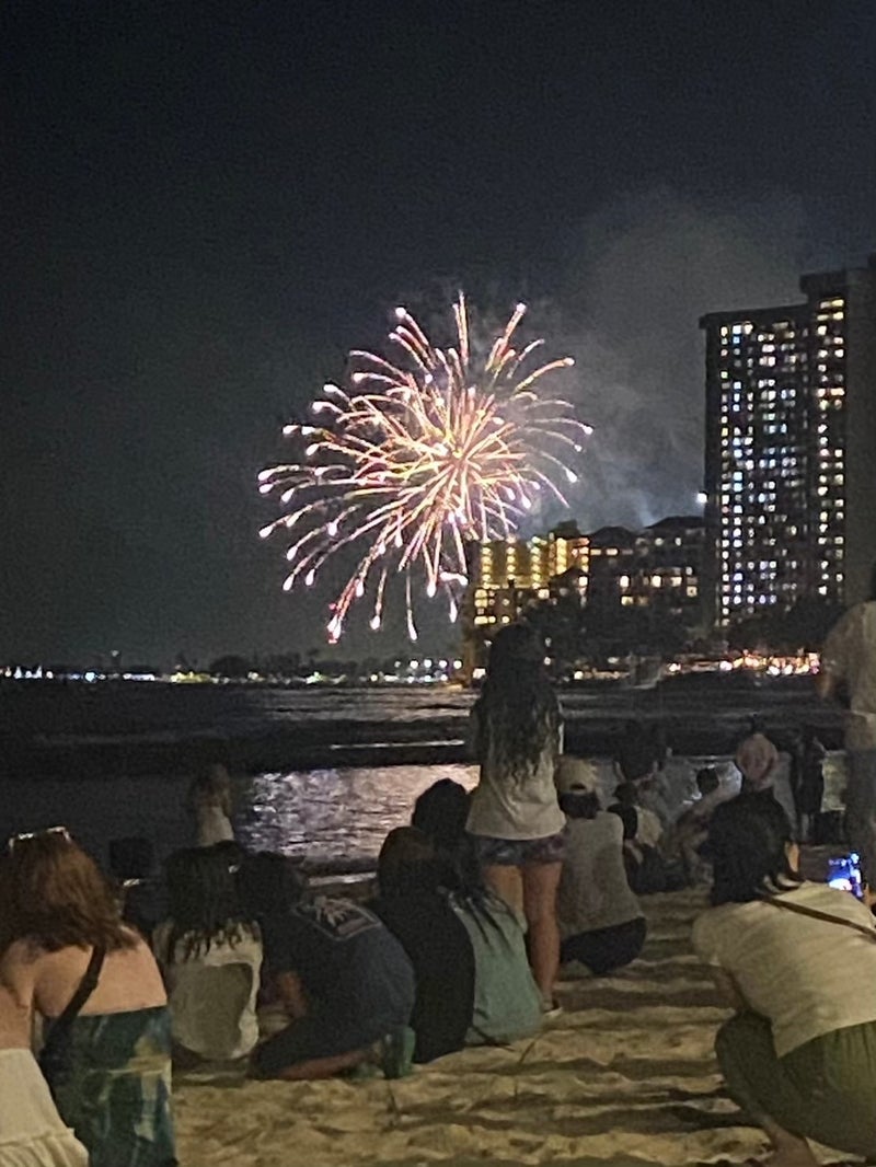 夜のビーチに響く花火の音と潮風が心地よく、ハワイで過ごす夜の思い出になりました。