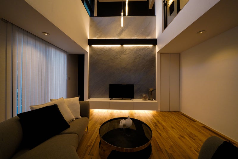 さらに↑のようにTV面にダウンライトを近づけて配灯すると壁に