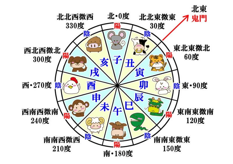 方位では北を子、東を卯、南を午、西を酉で表します。