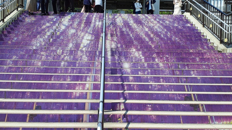 満開の藤は見られませんでしたが駅正面階段の藤の絵は満開で綺麗でした![]()