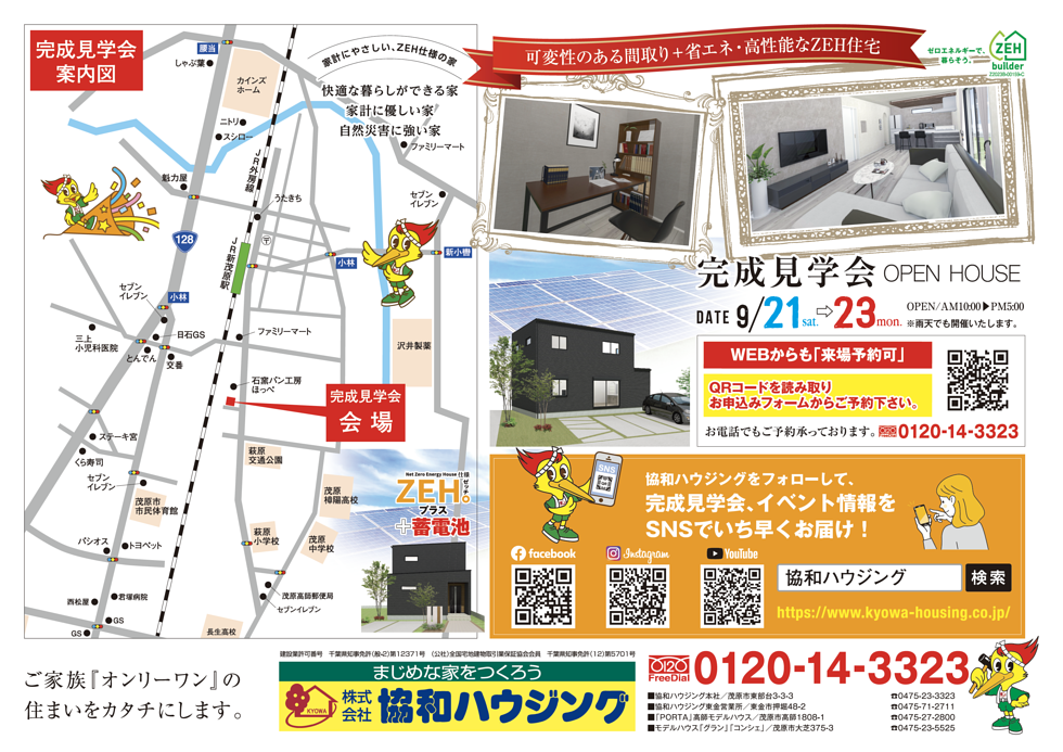 茂原市上林にて『可変性のある間取り+省エネ・高性能なZEH住宅』完成見学会を、オーナー様のご厚意により3日間開催させていただきます。