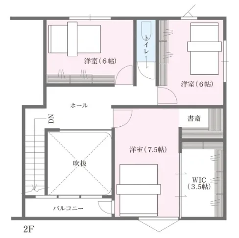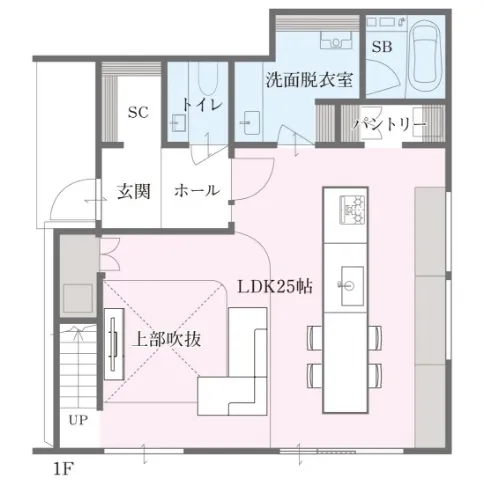 2階まで続く吹き抜けが生む開放感あふれる空間。高さと窓から注ぐ光が、家全体に心地よい風と豊かな表情をもたらします。