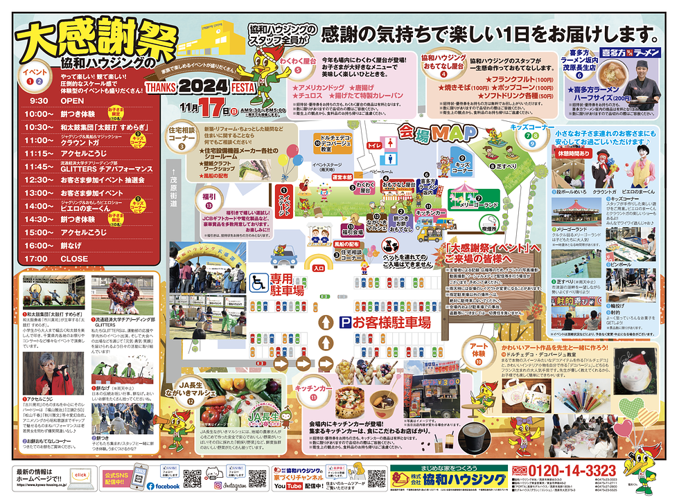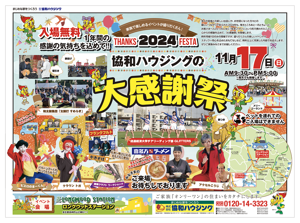 ものまね芸人のアクセルこうじさんのステージをはじめ、流通経済大学チアリーディング部GLITTERSさんや和太鼓集団太鼓内すめらぎさんのパフォーマンス、射的、餅つき、おもてなし屋台、喜多方ラーメン坂内茂原長生店、キッチンカー、ドルチェデコ・デコパージュ教室、メリーゴーランド、芝すべり、住宅相談コーナーなど、ご家族皆様で楽しんでいただけるイベントが盛りだくさんです!
