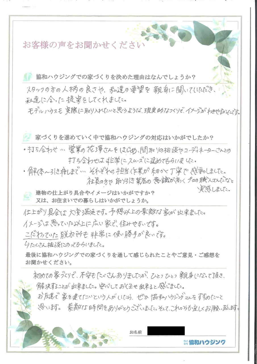 初めての家づくりで、不安もたくさんありましたが、ひとつひとつ親身になって頂き、解決することが出来ました。安心してお任せ出来ると感じました。 お友達で家を建てたいという人がいたら、ぜひ協和ハウジングさんをすすめたいと思います。 素敵な時間をありがとうございました。そして、これからも宜しくお願い致します。
