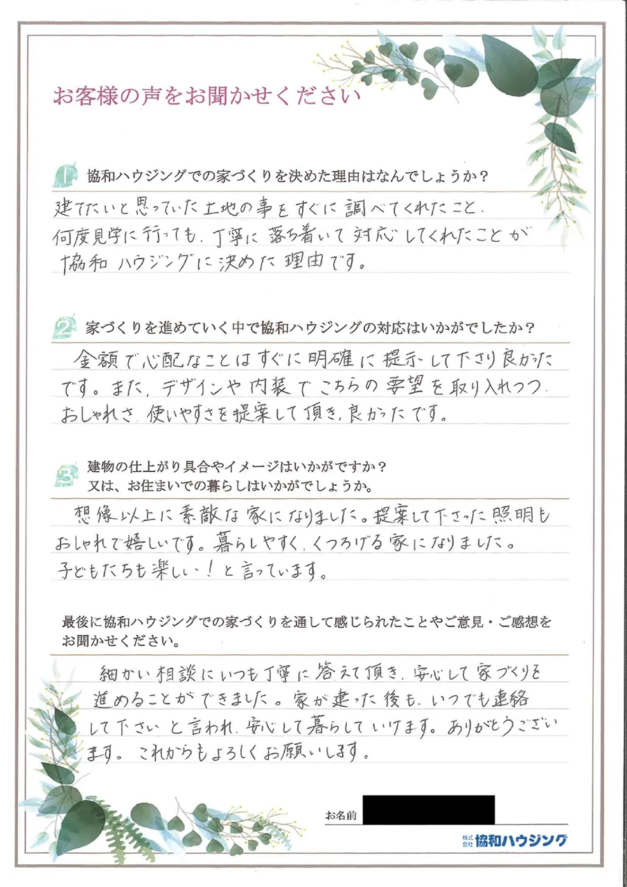 - 建てたいと思っていた土地の事をすぐに調べてくれたこと、何度見学に行っても、丁寧に落ち着いて対応してくれたことが協和ハウジングに決めた理由です。