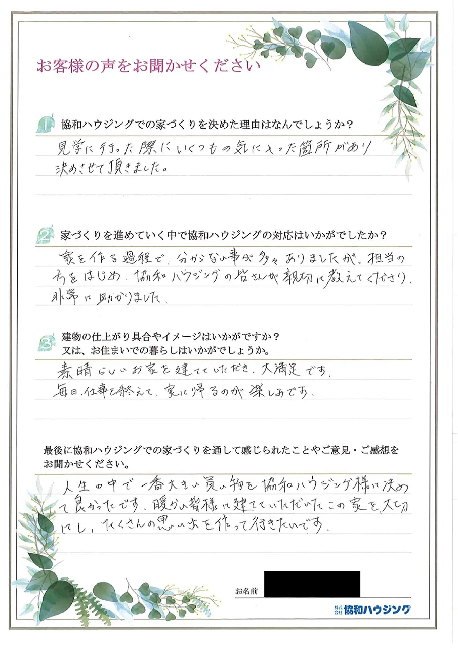 家を作る過程で、分からない事が多くありましたが、担当の方をはじめ、協和ハウジングの皆さんが親切に教えてくださり、非常に助かりました。