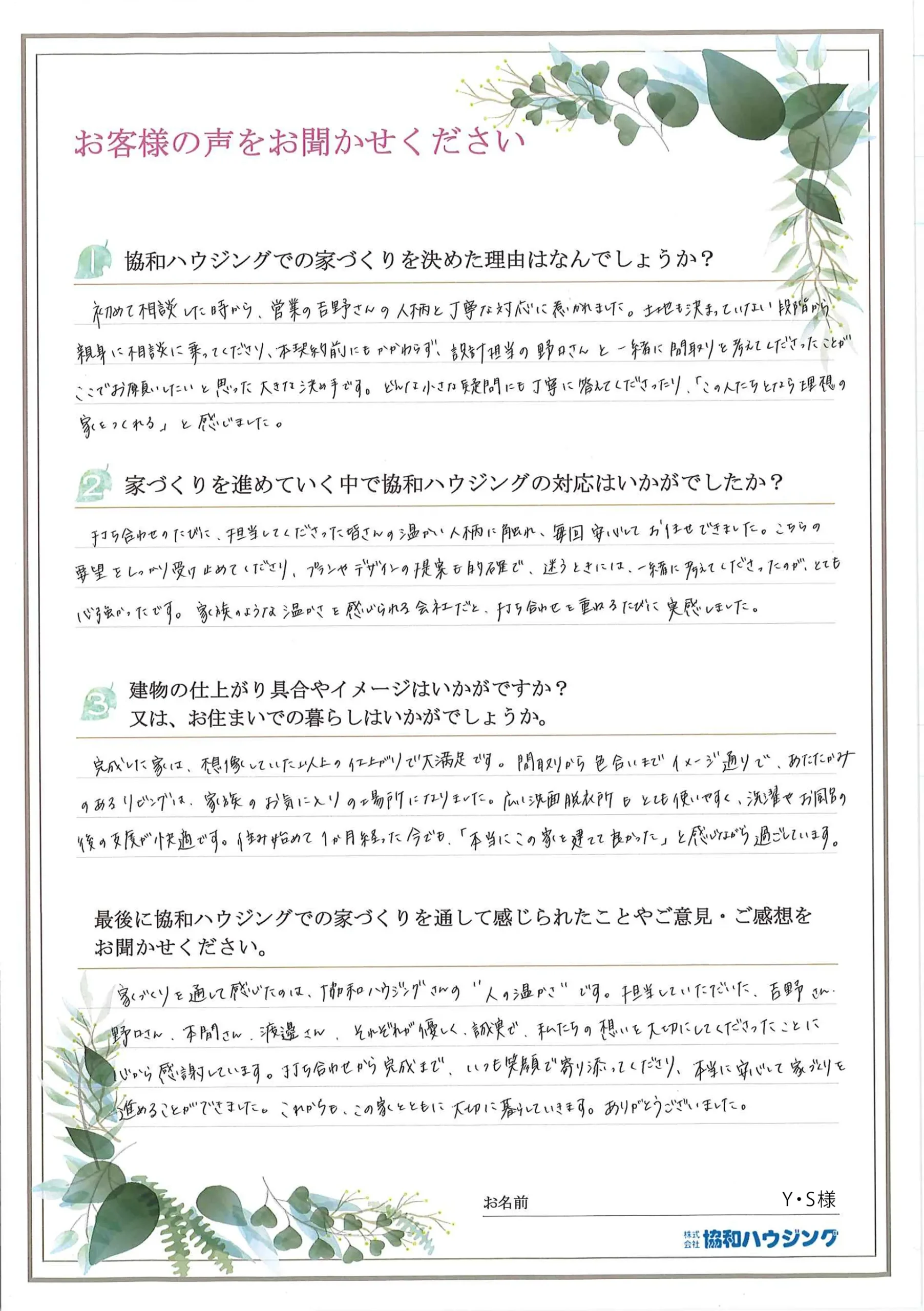 - 最後に協和ハウジングでの家づくりを通して感じられたことやご意見・ご感想をお聞かせください。